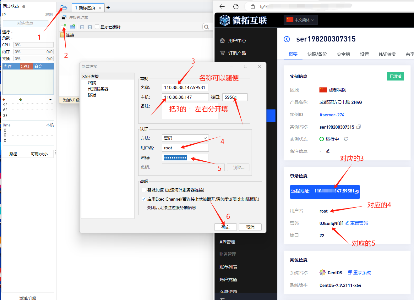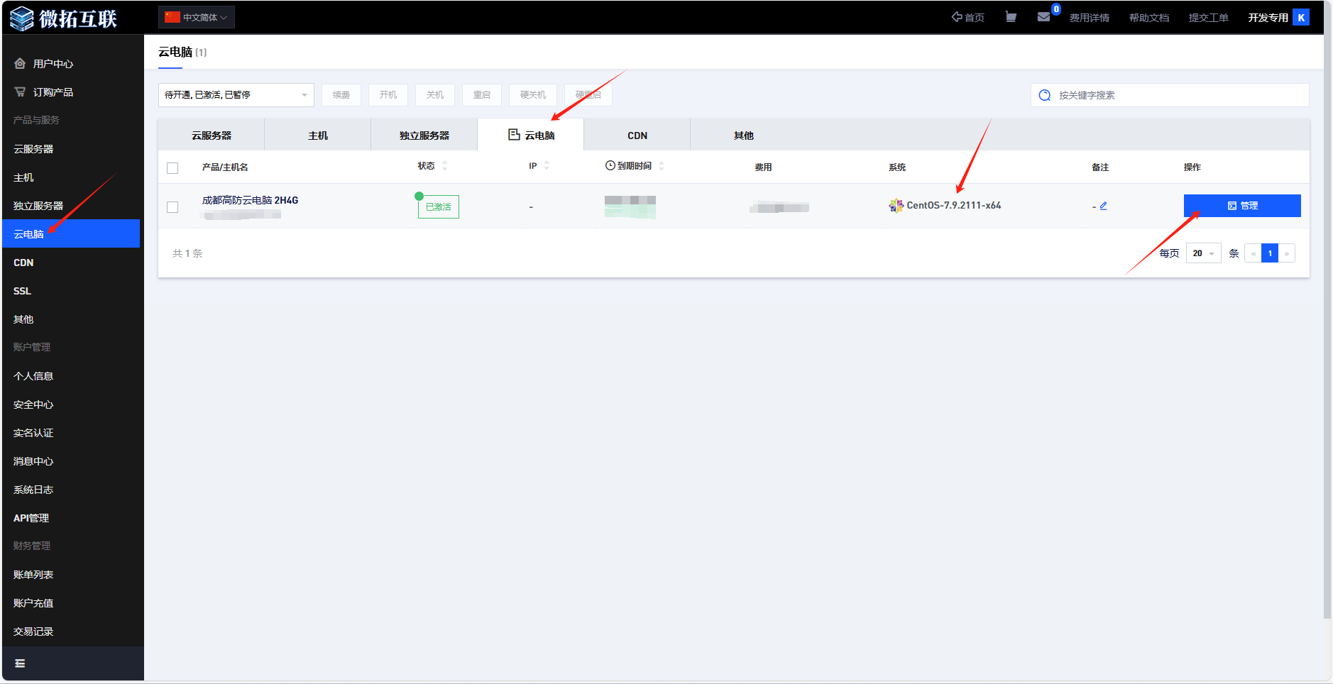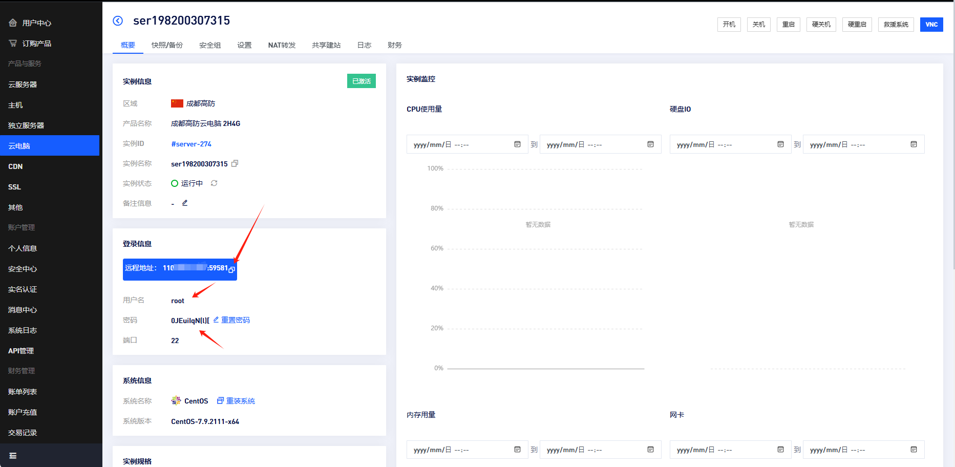 1)首先购买开通后,前往自己的用户中心,查看服务器信息