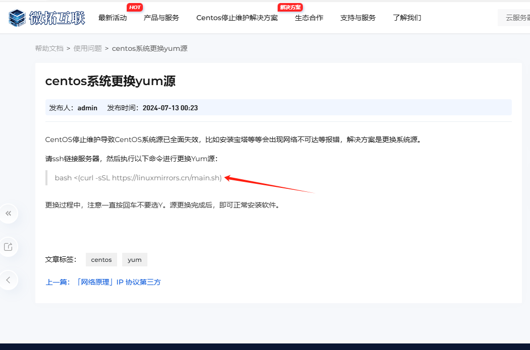 3)连接成功后,我们前往打开微拓互联的Centos停止维护解决方案,并执行里面yum的更换命令