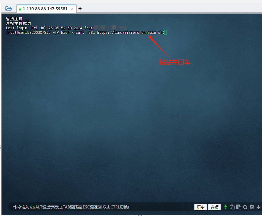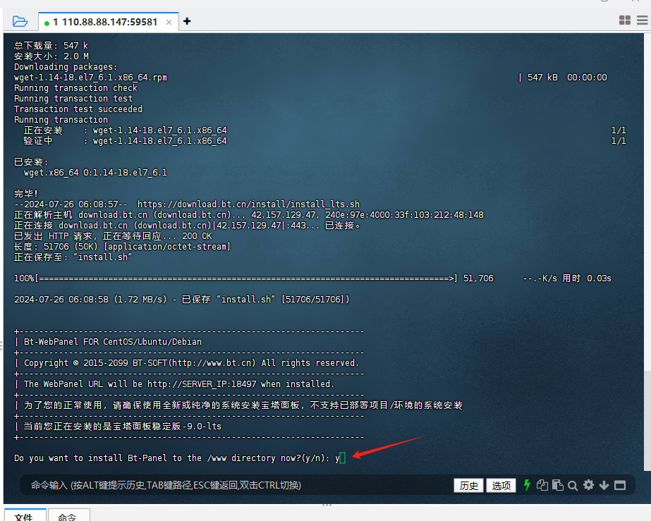 ②粘贴命令到FinalShell去并回车,中途会让你填y,然后你再回车等结束即可